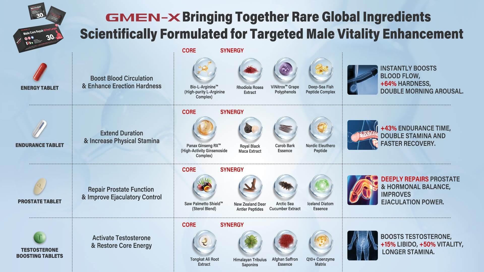 · Saw Palmetto blend and Arctic Sea Cucumber peptides: Targeting long-term male health, this combination effectively supports prostate wellness and internal function, providing a solid foundation for sustained vitality.
